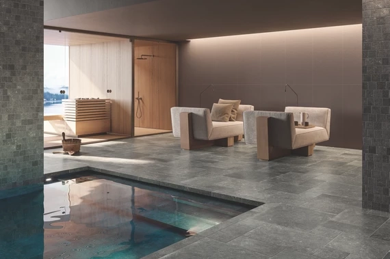 Une piscine intérieure, ce n'est pas seulement un luxe. C'est aussi un véritable espace bien-être, un havre de paix et de détente. Pour une touche de sophistication, un petit « plus » design, choisissez comme revêtement pour votre piscine un carrelage adapté ou une mosaïque et tout autour un carrelage grand format, afin de créer une ambiance élégante, harmonieuse, en parfaite adéquation avec l’univers carrelé de la maison. Un carrelage antidérapant qui plus est pratique, et facile à entretenir avec un minimum d'effort.