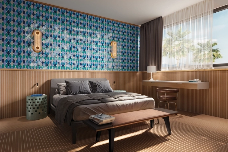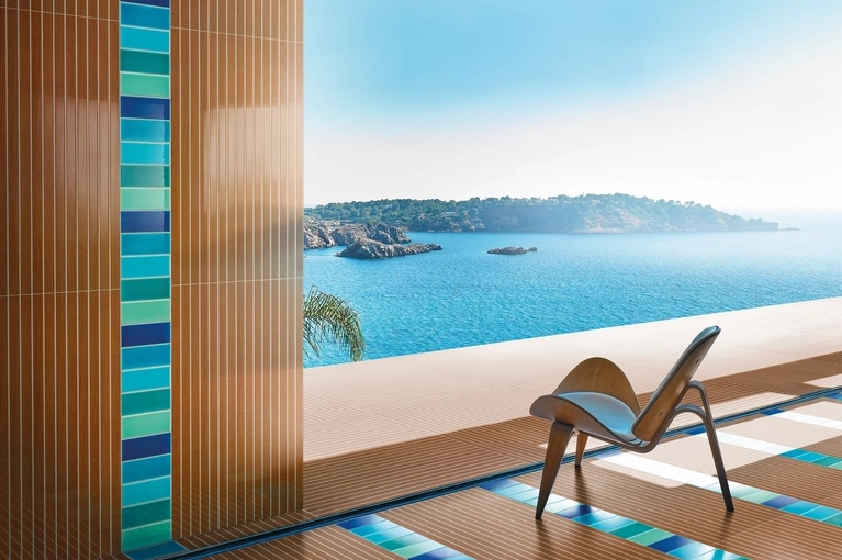 Évocation des plus beaux yachts de grande tradition maritime, ce superbe carrelage s’inspire des ponts de bateaux en reprenant le dessin des lattes de bois et de leurs joints, et en y associant des couleurs vives et chaleureuses issues de l’univers de la mer. Une idée pour la salle de bain, ou la terrasse, puisqu’il est conçu tant pour l’intérieur que pour l’extérieur.