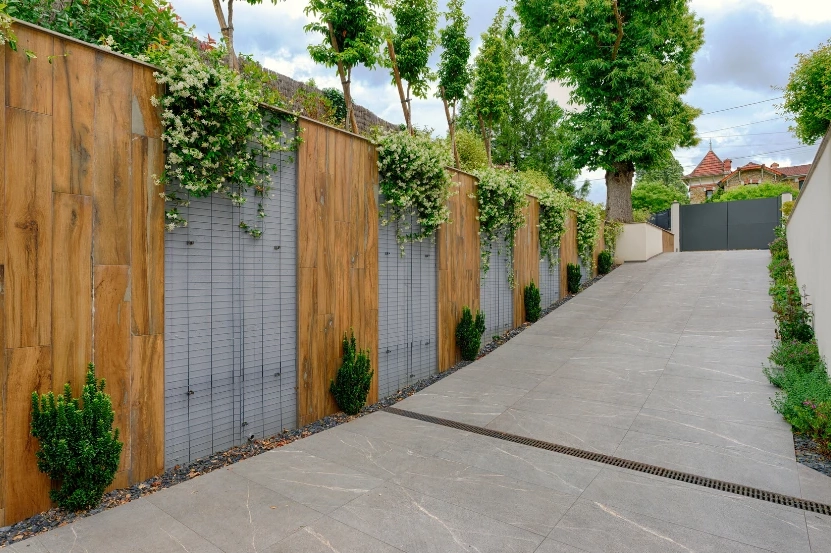 Ce projet extérieur met en valeur tout notre savoir-faire en pose de carrelage extérieur avec :