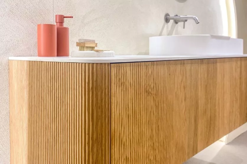 La douce atmosphère méditerranéenne de ces nouveaux meubles de salle de bains se ressent au premier regard. Ses cannelures en bois massif apportent une touche de sophistication et de modernité