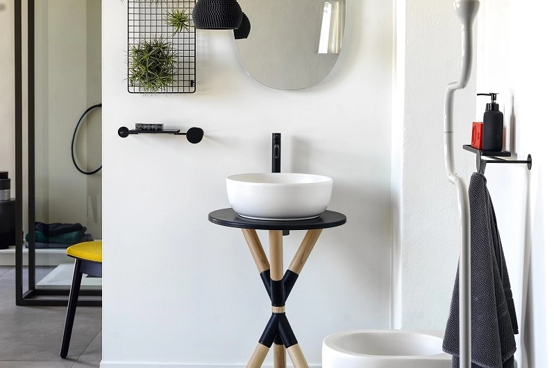 Une gamme d’accessoires coordonnés : miroirs, porte-serviettes, étagères, porte gobelet, achève l’embellissement de la pièce avec style et élégance.