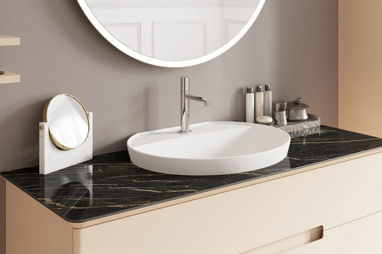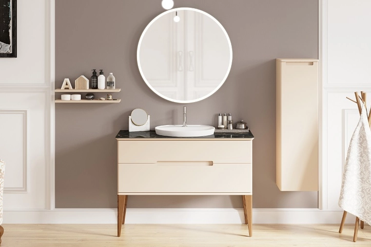 Sa personnalité ? Une alliance de différents matériaux très tendance – un plan vasque en céram decor mat ou brillant qui s’accorde avec raffinement aux tiroirs en laque mate ou brillante –, dans une palette de couleurs reposantes, voluptueuses ou dynamiques : blanc, crème, ivoire, lin, beige, gris pâle, fougère, terracota, curry, rouge impérial, bleu comète...