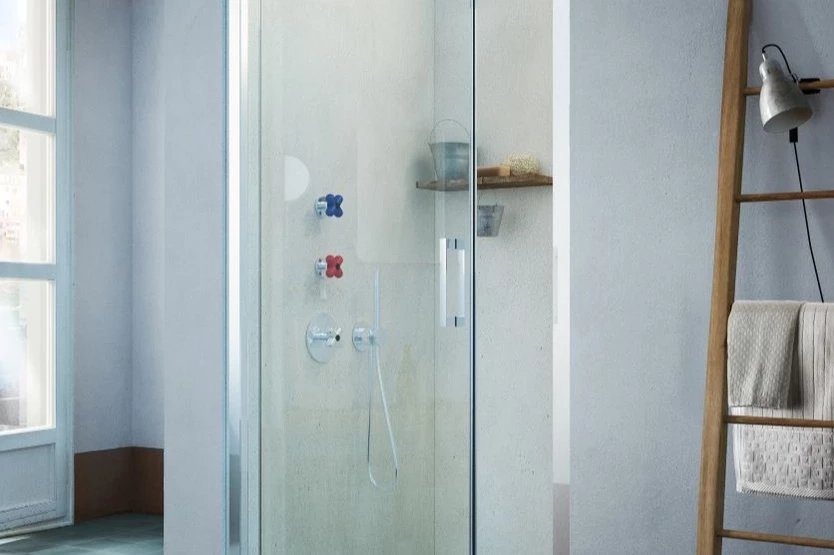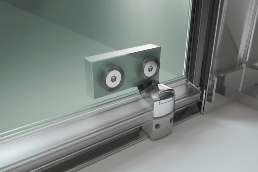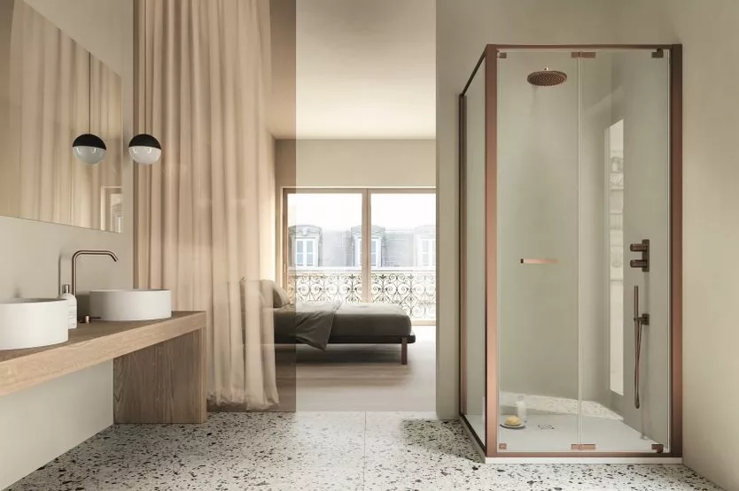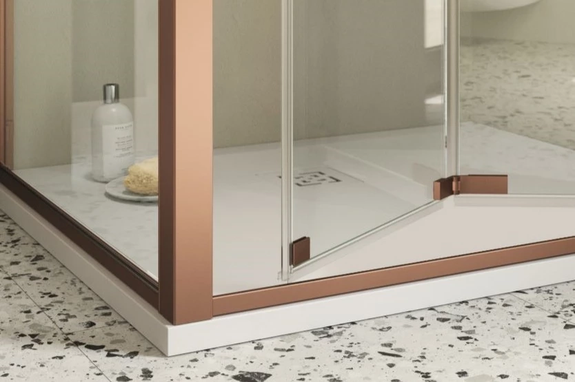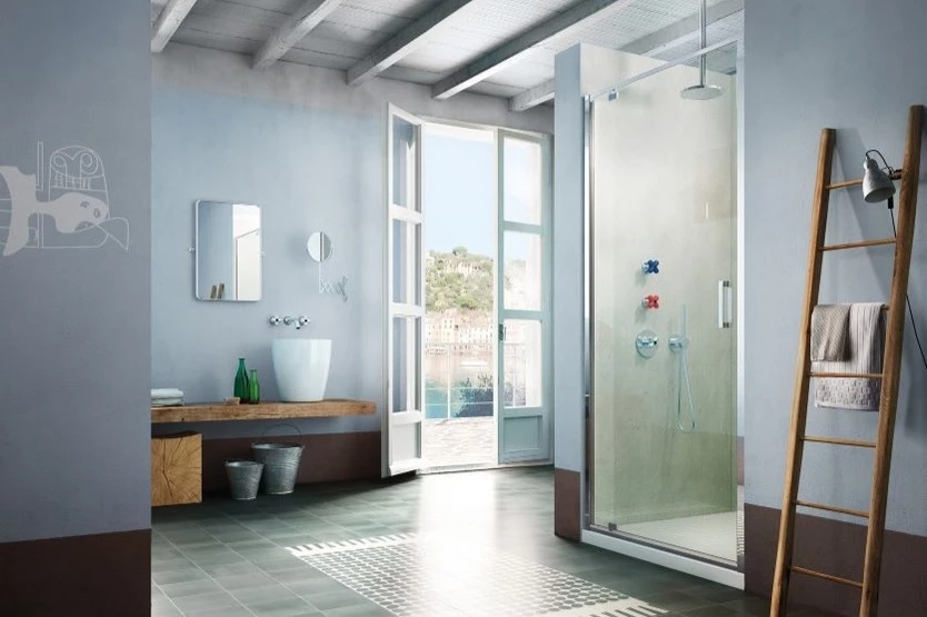 La cabine de douche Junior se concentre sur les éléments constitutifs essentiels: porte de douche battante, porte de douche pliante, paroi de douche côté fixe.