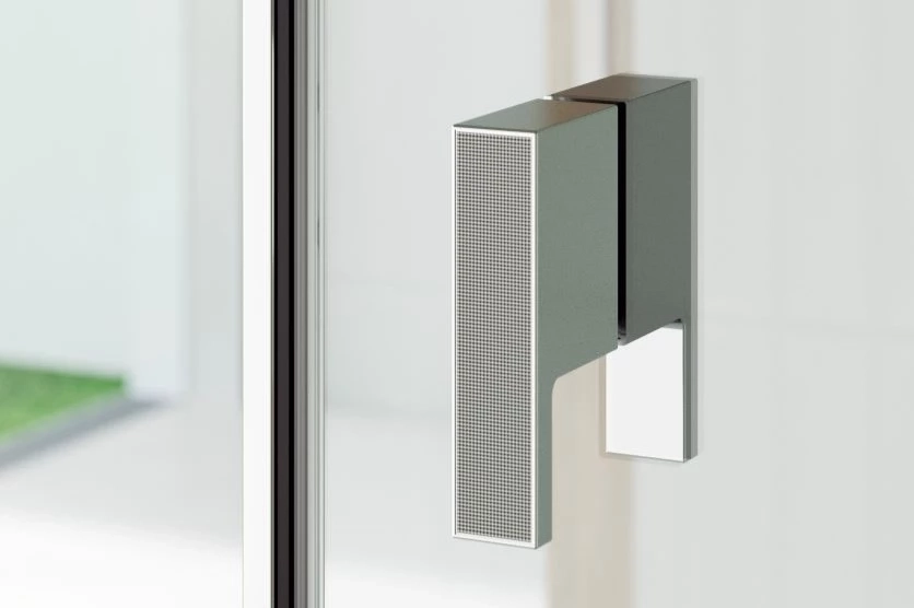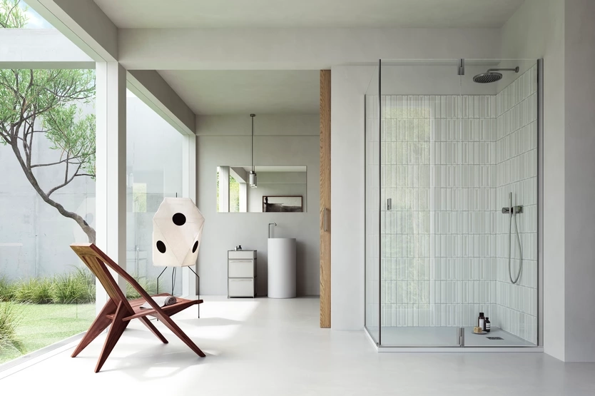 SuperSintesi est la nouvelle proposition pour une cabine de douche minimaliste avec porte battante sur charnières. Le verre trempé en 6 ou 8mm occupe l'espace.