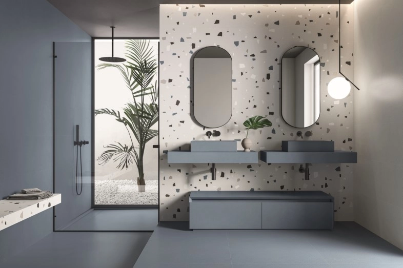 VIBRATO, un choix de carrelage parfait pour succomber aux dernières tendances de la décoration intérieure. Disponible en monochrome ou inspiré du terrazzo vénitien, il décore tant les intérieurs que les extérieurs avec style et modernité.