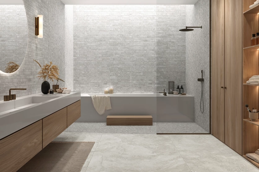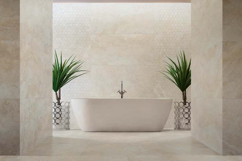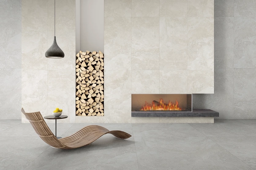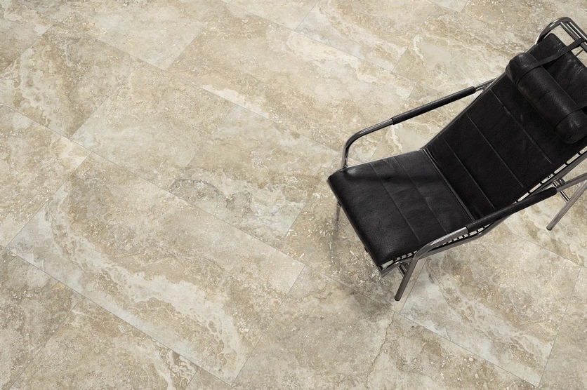 Carrelage, grès cérame effet marbre qui réinterprète le travertin grâce à des technologies innovantes qui mettent en valeur les qualités chromatiques et matérielles de la céramique.