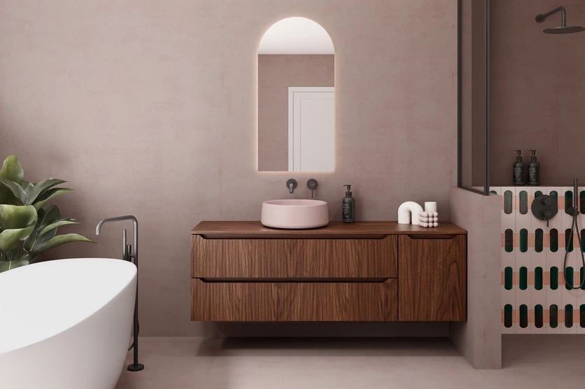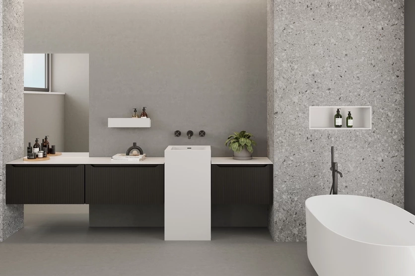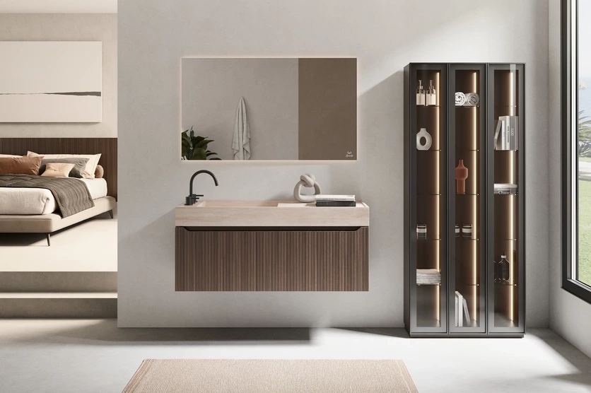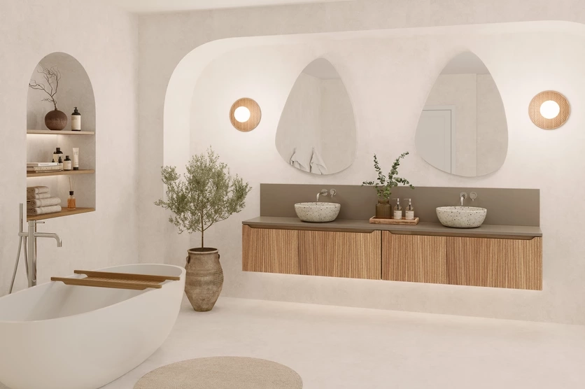 Meuble de salle de bain Alaska suspendu, vasque simple ou double, façade en bois naturel striée. Plan vasque en marbre ou compact.
