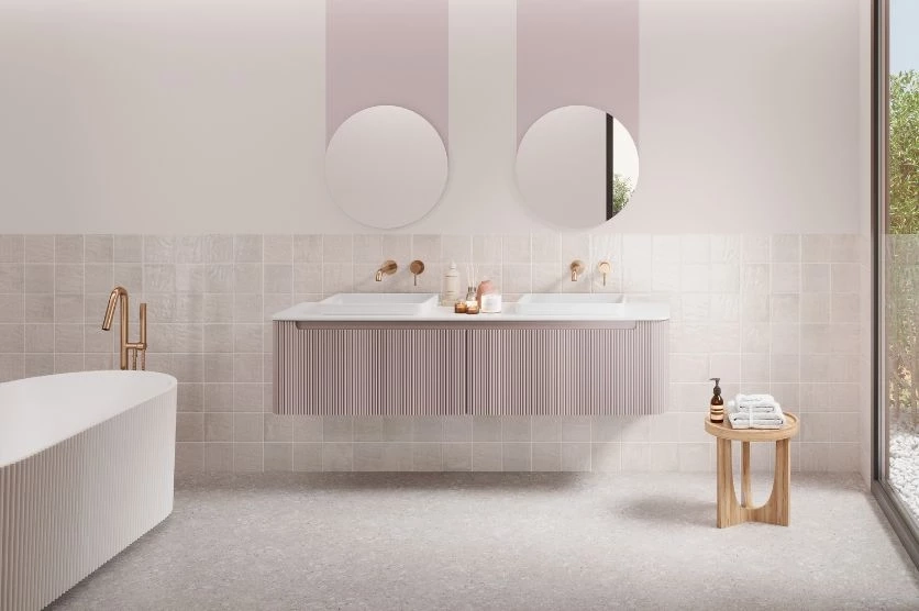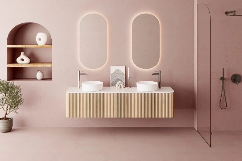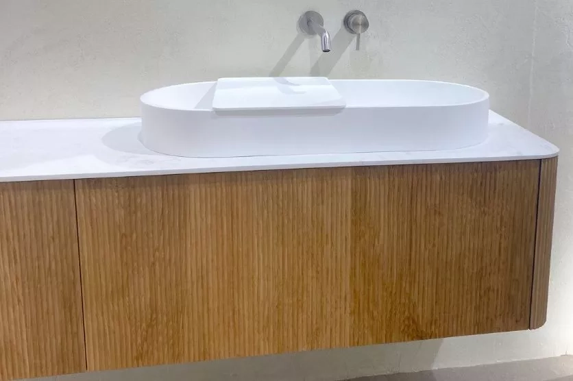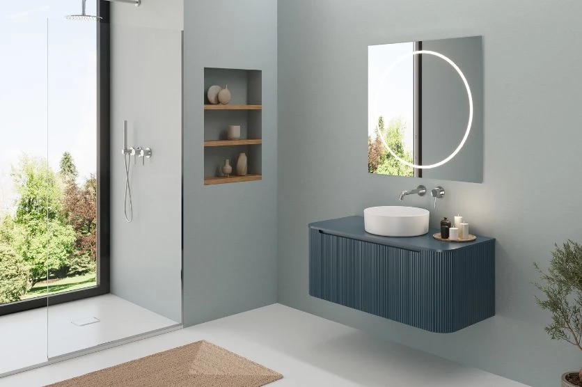 Meuble de salle de bain Charlotte suspendu, simple ou double vasque, façade striée avec coins arrondis. Plan vasque en marbre ou compact.