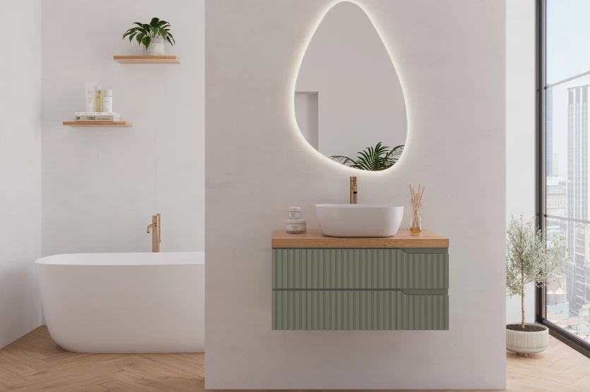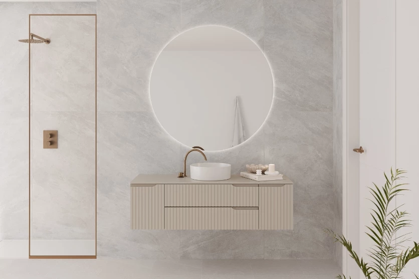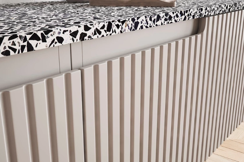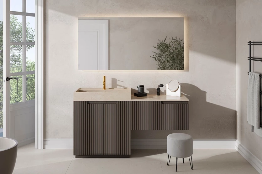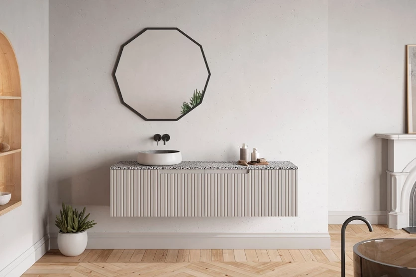 Façade texturée avec prise de main latérale, plan terrazzo et vasque à poser soulignent l’élégance intemporelle du meuble de salle de bain Nepal.