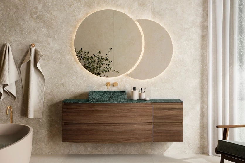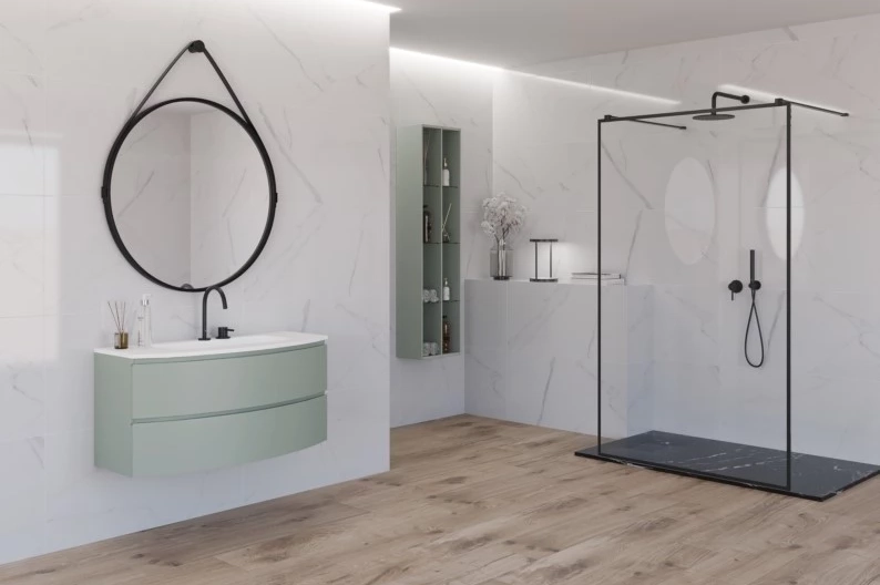 Newport, meuble galbé d'exception, allie fonctionnalité, élégance et confort pour une salle de bains sophistiquée. Succombez à son charme irrésistible !