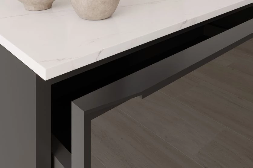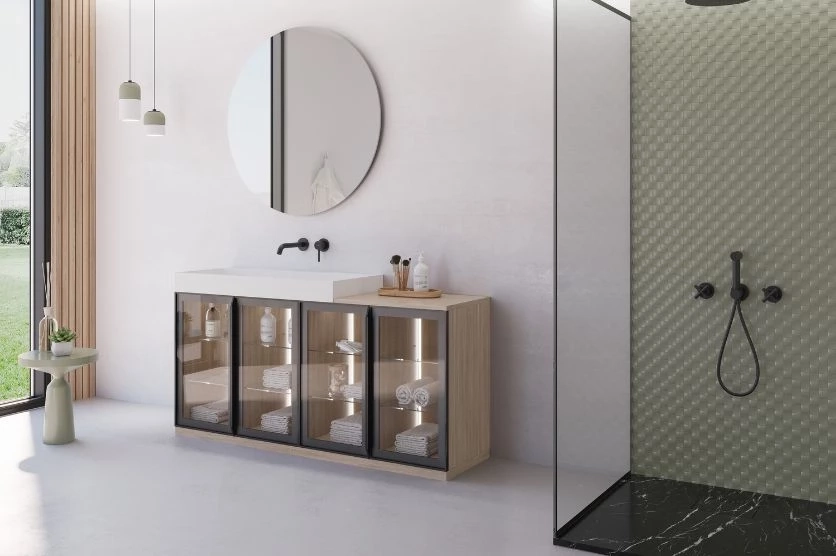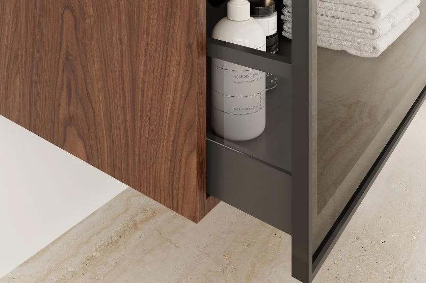 Le meuble de salle de bain Tokyo se décline en version à 1 tiroir ou en version à 2 portes de 60 à 120 cm. Possibilité de positionner un plan vasque moulé ou une vasque à poser sur un plan en marbre ou compact. Un cadre en métal anthracite/noir conforte le design contemporain du meuble Tokyo et encadre le verre bronze ou miroir de la façade.