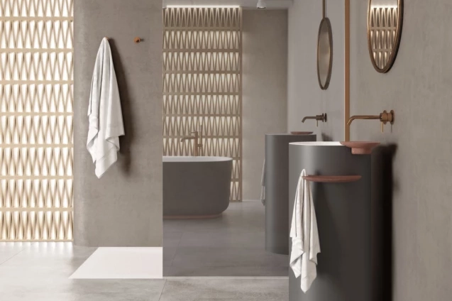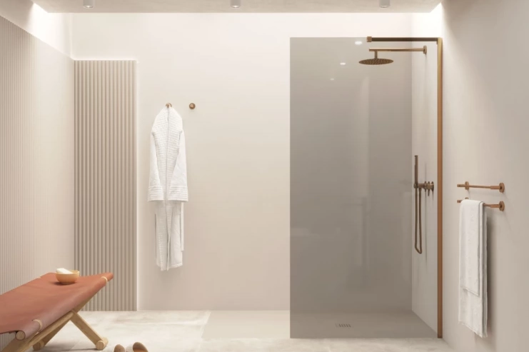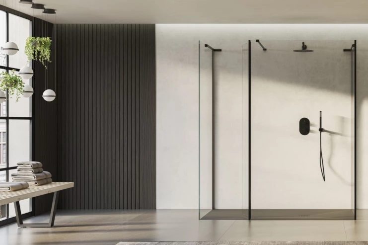 Paroi de douche ouverte avec profilé coordonné à la robinetterie et aux accessoires. Paroi fixe H 200 cm, largeur 70 à 140 cm, porte pivotante complémentaire.