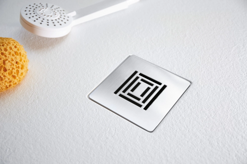 Receveur de douche Logic recoupable sur mesure avec grille d'évacuation en inox, finition Blanc mat aspect ardoise. Disponible en version avec rebord.