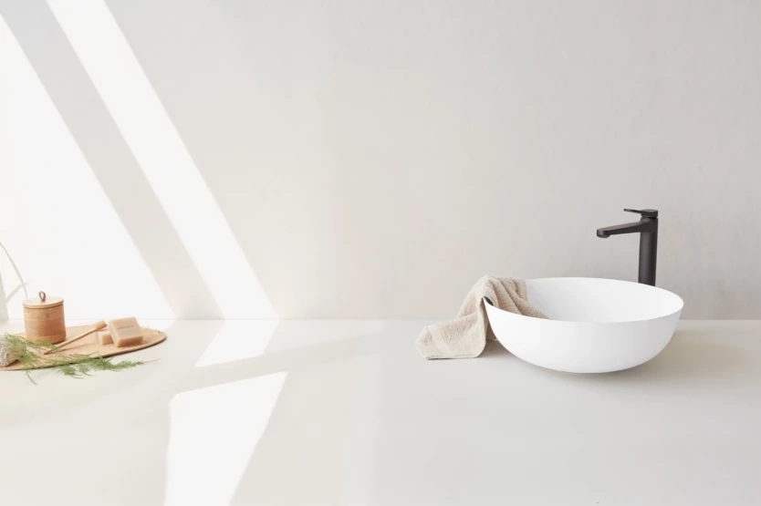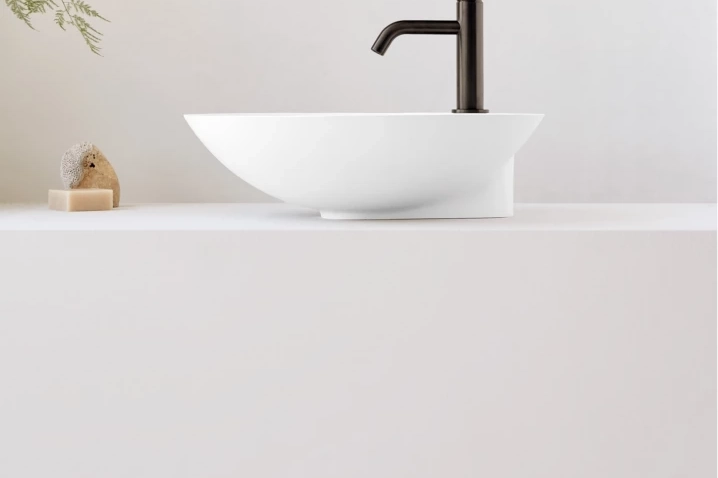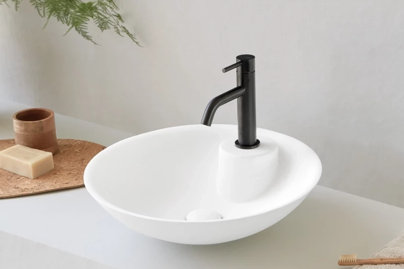 Vasque à poser Bol rond gel coat blanc mat. Version TP avec robinetterie sur vasque. Disponible dans tous coloris RAL.